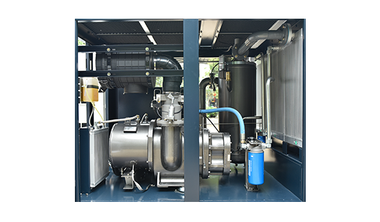 The design of the built-in pipeline is more compact. We reduce the bellows between the first and second stage air-end, reducing pressure loss. The optimized built-in main oil injection pipe, bearing lubrication, and oil return pipe achieves a good cooling effect. The leakage and pipe vibration were avoided due to reducing most of the outside pipelines.